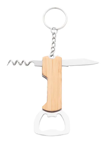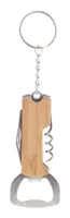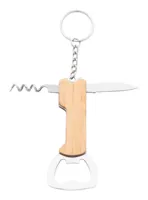 Bambusz és rozsdamentes acél üvegnyitós kulcstartó dugóhúzóval és zsebkéssel.