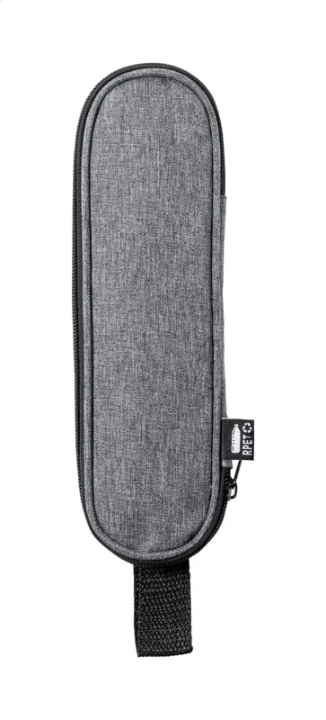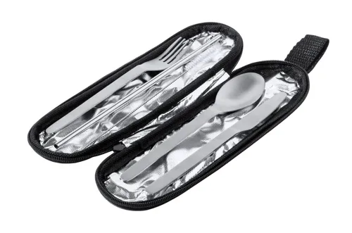 5 darabos rozsdamentes acél evőeszköz készlet, RPET poliészter tasakban. Villát, kést, kanalat, szívószálat és egy tisztítókefét tartalmaz.