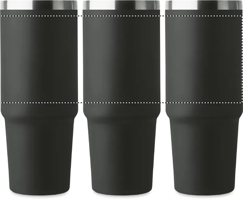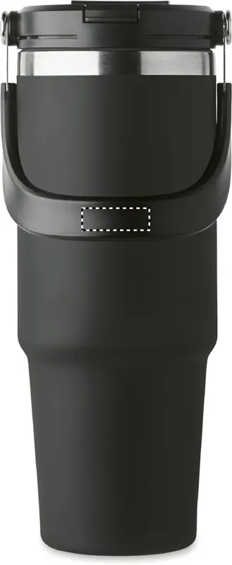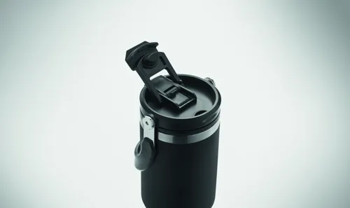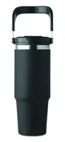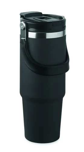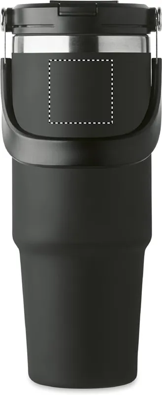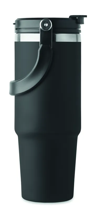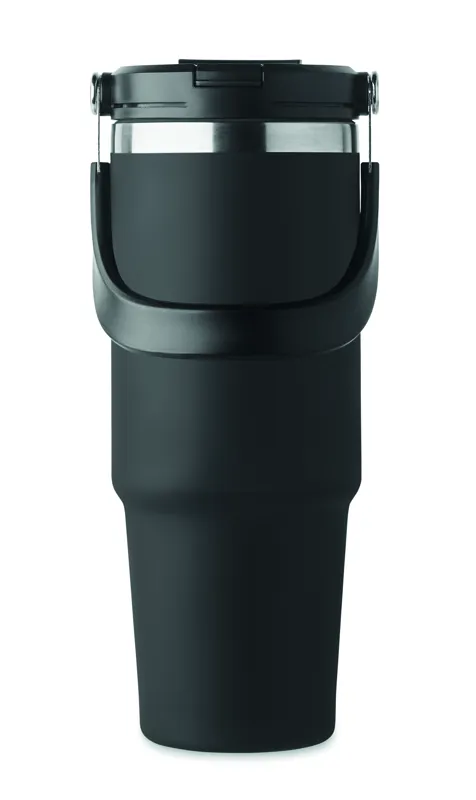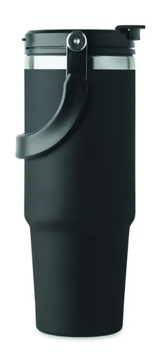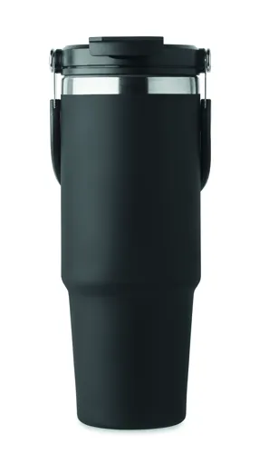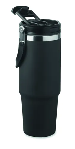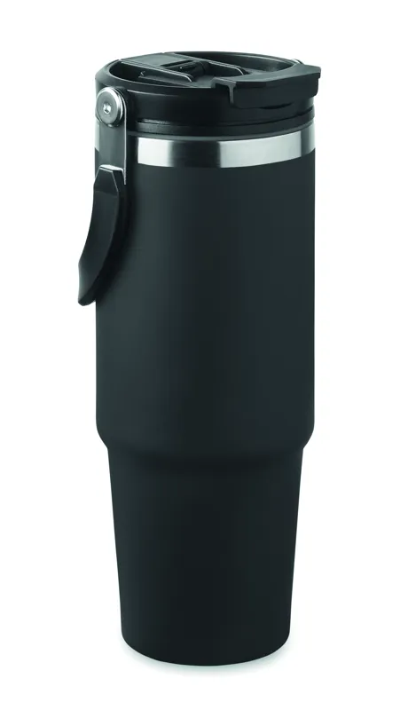 Duplafalú pohár újrahasznosított rozsdamentes acélból (90% újrahasznosított rozsdamentes acél és 10% rozsdamentes acél). Fedél belső szívószállal, kihajtható valamint nyitható ivónyílással. Űrtartalom: 850 ml.