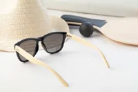 Műanyag napszemüveg, bambusz szárakkal és foncsorozott lencsékkel. UV 400 fényvédelemmel.