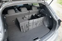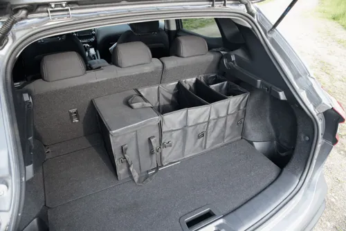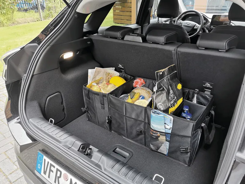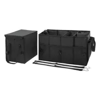 SUPER GADGET autós csomagtér táska: összecsukható, 2 táskából áll, amelyek egymáshoz rögzíthetők, 1 táska fedéllel és füllel, 1 nagy táska 3 rugalmas válaszfallal, fogantyúkkal, 2 becsúsztatós zsebel- az oldalon lévő zsebek és hálós első zsebek, megerősített talp, 2 öv és számos kapocs, alul tépőzáras hevederek a biztonságos rögzítéshez az autóban