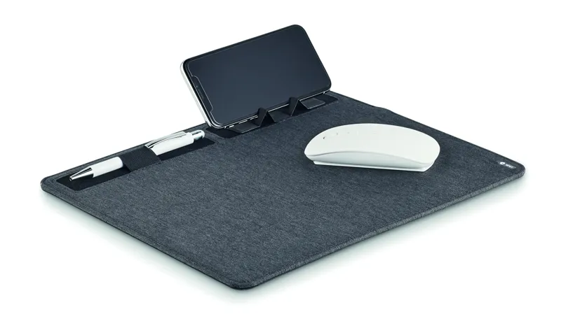 Multifunkcionális melírozott színű 300D poliészter RPET egéralátét 15W- os vezeték nélküli töltővel és telefonállvány funkcióval. Teljesítmény: DC 9V/1.6A (15W) a gyors töltéshez.