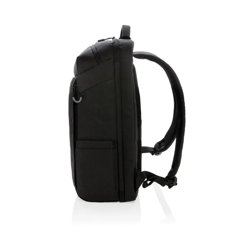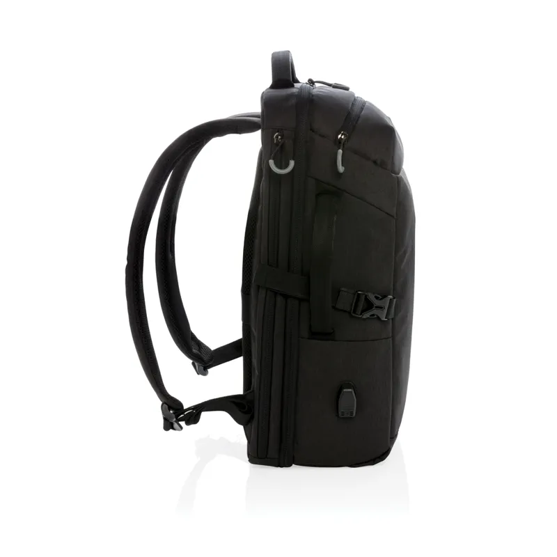 Kézipoggyásznak megfelelő hátizsák hétvégi kirándulásokhoz. Párnázott 17"-es laptop rekesszel készüléke védelméért. A táska a kerekek és a fogantyú súlya nélkül képes egy gurulós bőrönd kapacitására, a hátizsák mobilisabbá teszi és leegyszerűsíti az utazást. Utazzon könnyedén! A bőrönd fogójára akasztható hevederrel, oldalsó zsebbel vizespalacknak és USB A kimenettel. Könnyen hozzáférhető felső zseb, elülső cipzáras zseb és RFID-védett zsebek. AWARE™ nyomjelzővel, amely igazolja az újrahasznosított anyagok valódi használatát. Minden táska 35,5 db 0,5 literes PET palackból készül. Minden eladott Impact termék után 2%-kal támogatjuk a Water.org nonprofit szervezetet. PVC-mentes.