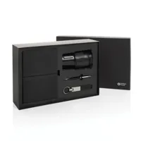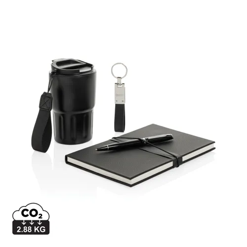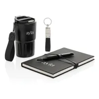 "Tartalmazza mindazokat a nélkülözhetetlen dolgokat, amikre szüksége van ahhoz, hogy stílusosan átvészelje a munkanapot. A 350 ml-es, duplafalú pohár vákuumszigetelt, így hosszabb ideig melegen vagy hidegen tartja az italt. A szivárgásmentes fedél biztosítja, hogy a ruha száraz maradjon, még akkor is, ha a pohár véletlenül eldől.Annak érdekében, hogy a legfontosabb kulcsokat mindig elérhető közelségben tartsa, a csomag tartalmaz egy prémium Swiss Peak kulcstartót fényes fémes felülettel és szépen megmunkált PU bőrszíjjal.Le kell írnia néhány gondolatot vagy ötletet? Stílusos üzleti golyóstollal, amelynek íráshossza 1000 méter, és puha tapintású PU jegyzetfüzettel, amely újrahasznosított poliészterből készült. A jegyzetfüzet 160 krémszínű oldalt tartalmaz, amely újrahasznosított papírból készült.Az ajándékcsomag egész tartalma RCS-tanúsítvánnyal rendelkezik, garantálva a felhasznált újrahasznosított anyagok ellátási láncát. 75% újrahasznosított anyagot tartalmaz."