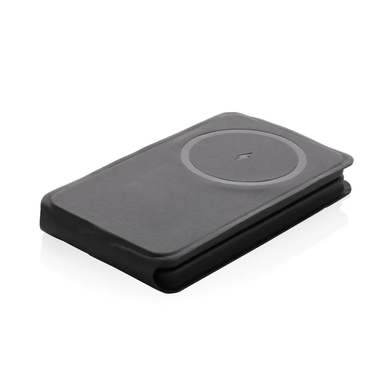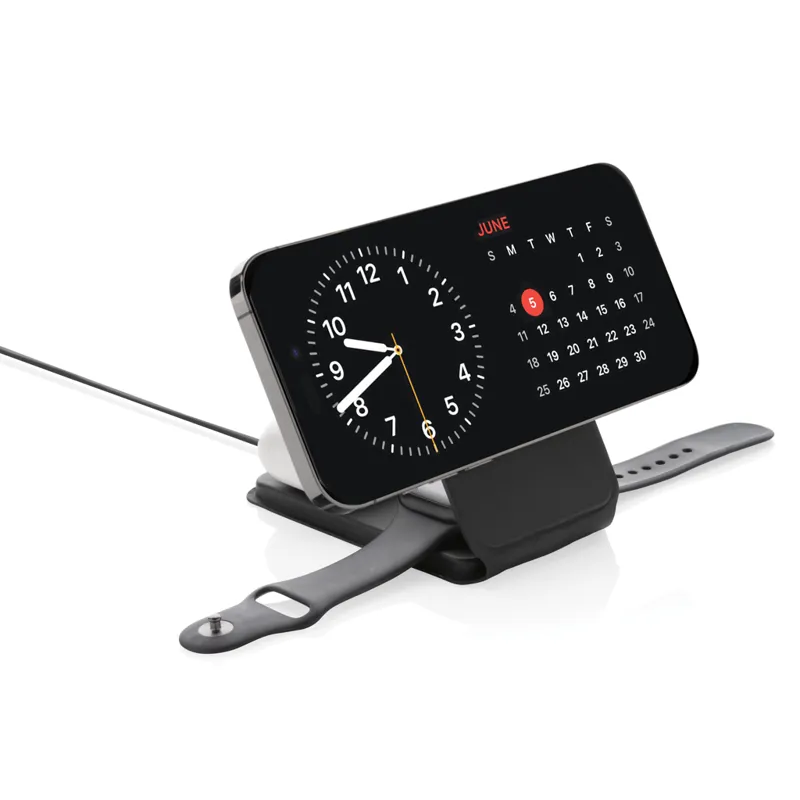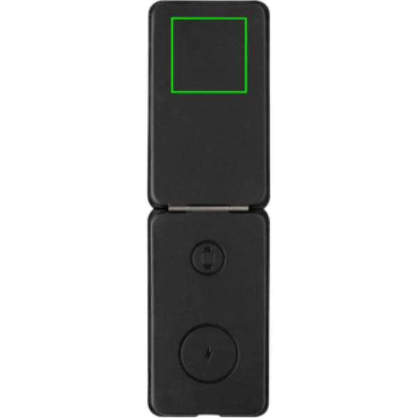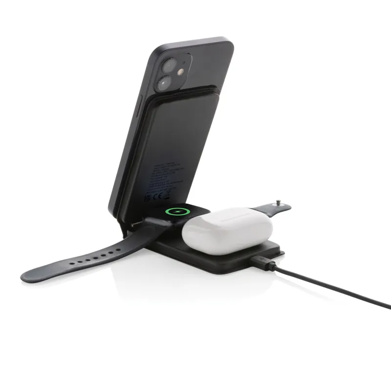 Elegáns és összehajtható, 3 az 1-ben vezeték nélküli töltő RCS újrahasznosított PU-ból. Teljes újrahasznosított anyag tartalom: 5% a termék összsúlya alapján. Az RCS-tanúsítvány biztosítja az újrahasznosított anyagok ellátási láncát. A vezeték nélküli töltő előlapján egy mágneses, 15W-os vezeték nélküli töltő található, a hátoldalon pedig egy további 5W-os vezeték nélküli töltő, amely alkalmas fülhallgató tokokhoz vagy más, kisméretű, vezeték nélküli tölthető eszközökhöz, valamint 2,5W-os vezeték nélküli töltő okosórákhoz kizárólag Apple watch) RCS 120 cm-es újrahasznosított TPE kábellel. FSC® mix kraft csomagolásban. A termék és tartozékai 100% PVC-mentesek. Bemenete: 9 V/3 A az optimális használathoz. Kimenete: Elején: 9 V/1,1 A; 9 V/1,67 A/(15 W), Fülhallgató: 5 V/1 A (5 W), Óra: 5 V/0,5 A.