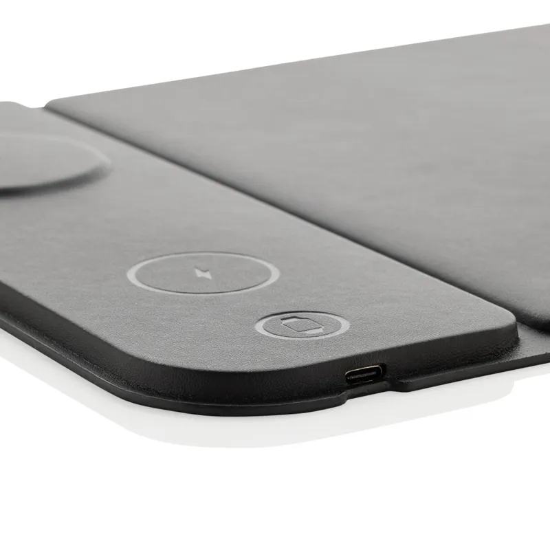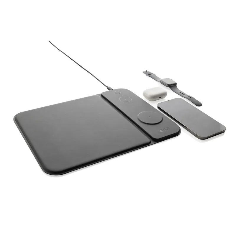 "Elegáns 3 az 1-ben vezeték nélküli töltő egérpad RCS újrahasznosított PU-ból és RCS újrahasznosított alumíniumból. Teljes újrahasznosított anyagtartalom: 5% a termék összsúlya alapján. Az RCS-tanúsítvány biztosítja az újrahasznosított anyagok ellátási láncát. Mágneses 15 W-os vezeték nélküli töltővel és egy további 5 W-os vezeték nélküli töltővel, ami fülhallgató tokokhoz vagy más, kisméretű vezeték nélkül tölthető eszközökhöz alkalmas, valamint egy 2,5 W-os vezeték nélküli töltővel okosórákhoz (csak Apple órákhoz). 120 cm-es RCS újrahasznosított TPE kábellel. FSC® mix csomagolásban. A termék és tartozékai 100% PVC-mentesek. Bemenet: 9 V/3 A az optimális használathoz. Kimenet: Telefon: 9 V/1,1 A; 9 V/1,67 A/(15 W), Fülhallgató: 5 V/1 A (5 W), Óra: 5 V/0,5 A."