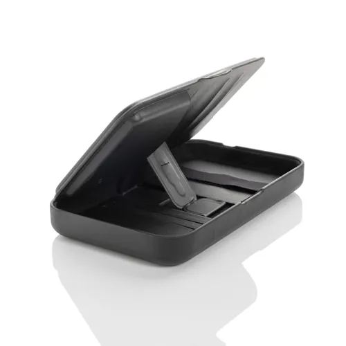 Kemény borítású utazótáska beépített 3 az 1-ben vezeték nélküli töltővel, amely RCS újrahasznosított PU-ból készült. Teljes újrahasznosított anyagtartalom: 5% a termék összsúlya alapján. Az RCS-tanúsítvány biztosítja az újrahasznosított anyagok ellátási láncát. Az utazótáska tárolóhelyet biztosít az útlevélnek, több kártyának, kábeltartóval rendelkezik. Mágneses 15W-os vezeték nélküli töltővel és egy további 5W-os vezeték nélküli töltővel, amely fülhallgató tokokhoz vagy más kisméretű vezeték nélküli tölthető eszközökhöz alkalmas, valamint egy 2,5W-os vezeték nélküli töltővel okosórákhoz (csak Apple órákhoz). Tökéletes az összes értéktárgy szállítására és az összes eszköz töltésére. Belül egy kis mágneses pénztárca is található, amely kivehető. 120 cm-es TPE kábellel. FSC® mix csomagolásban. A termék és tartozékai 100% PVC-mentesek. Minimális bemenet: 9 V/3 A az optimális használathoz. Kimenet: telefon: 9 V/1,1 A; 9 V/1,67 A/(15 W), fülhallgató: 5 V/1 A (5 W), óra: 5 V/0,5 A.