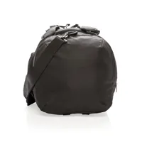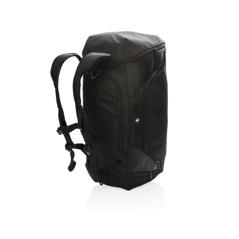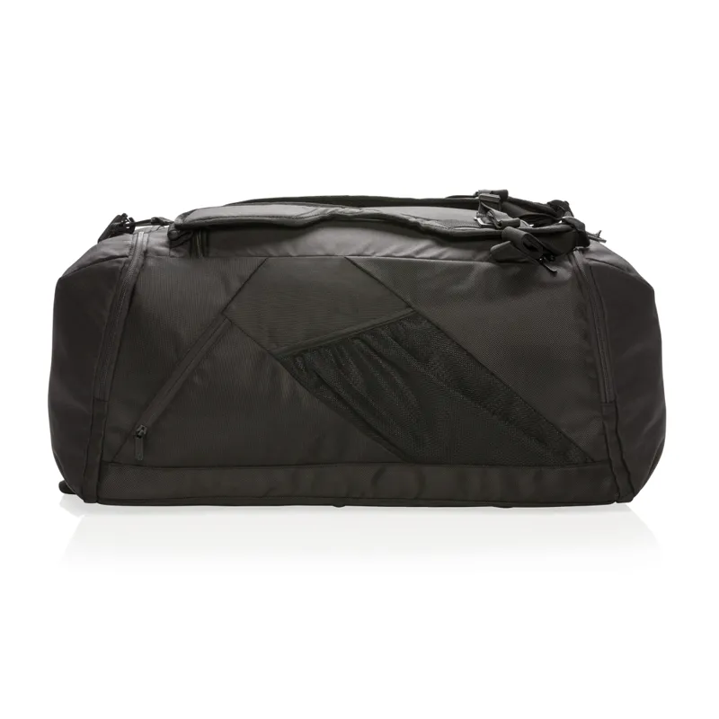 Könnyű, 1680D és 600D poliészter 2 az 1-ben táska. Hátizsákként illetve utazótáskaként is használható. Tágas főrekesze U-alakú cipzárral ellátott, oldalsó rekesze cipő illetve használt ruha tárolására alkalmas. Rendelkezik továbbá egy oldalsó cipzáras zsebbel. Az elülső részén található 2 rekesz RFID védelemmel rendelkezik. Hátulján kulacstartóval illetve egy könnyen hozzáférhető zsebbel. Állítható vállpánt. PVC-mentes.