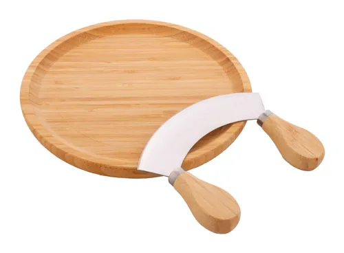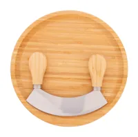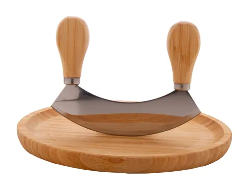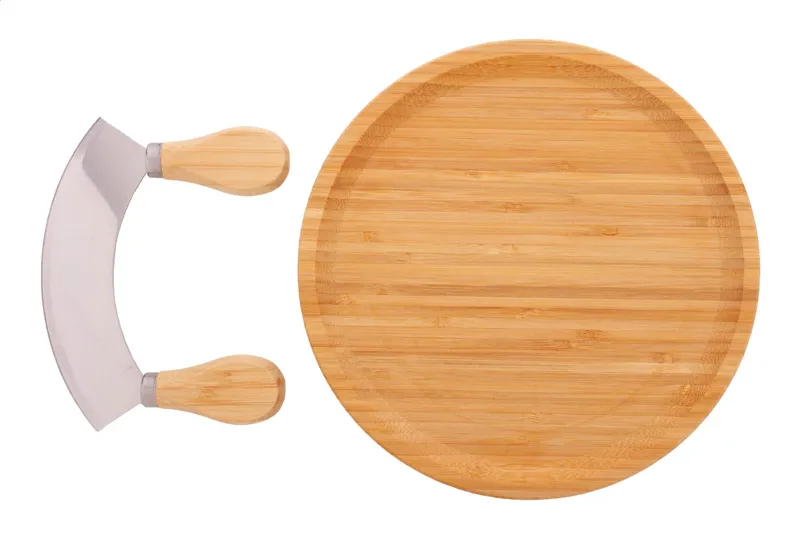 Bambusz fűszernövényvágó szett, amely tartalmaz egy kerek bambusz vágódeszkát és egy rozsdamentes acél fűszernövényvágót bambusz fogantyúval.