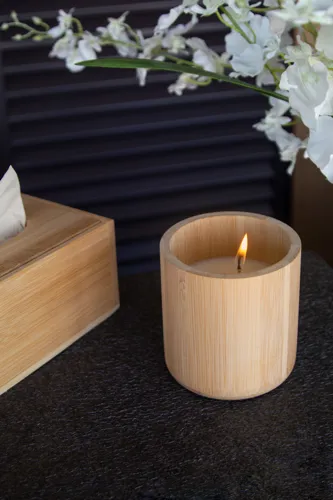 Vanília illatú növényi alapú illatgyertya bambusz tartóban. 160 gramm viaszt tartalmaz. Kraft papír dobozban szállítjuk.