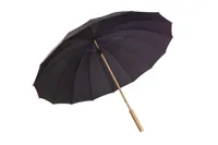 Manuális, szélálló esernyő 16 panellel, bambusz nyéllel, üvegszálas vázzal és bordázattal. Színben megegyező tasakban. 190T RPET pongee. Megkülönböztető RPET címkével.