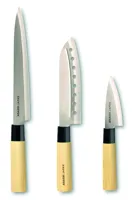 3 részes japán stílusú késkészlet papír ajándékdobozban. Rozsdamentes acél penge, PP műanyag nyél.