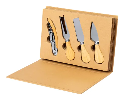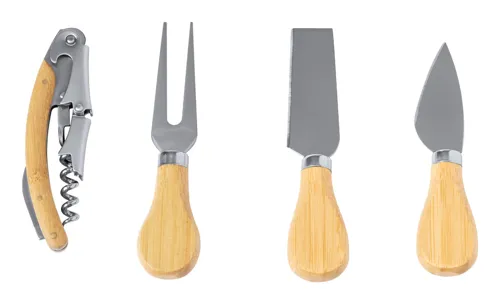 4 db rozsdamentes acél, bambusz nyelű boros és sajtkés szett újrahasznosított kraft papírból készült könyv alakú dobozban. Dugóhúzóval, 2 sajtkéssel és sajtvillával.