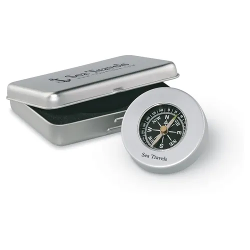Klasszikus stílusú alumínium iránytű bádogdobozban.