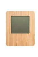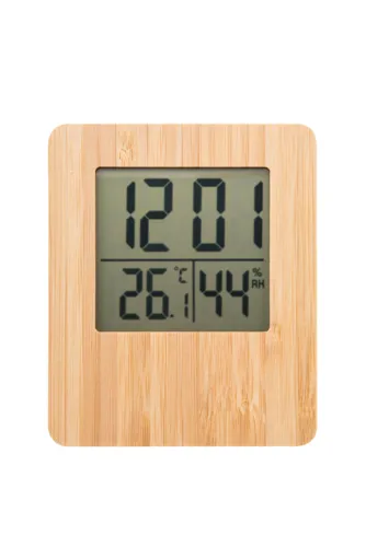 Időjárás állomás és digitális óra bambusz előlappal. Funkciók: ébresztőóra, naptár, hőmérő és páratartalom mérő. 2 db AAA elemmel működik, elem nélkül szállítjuk.