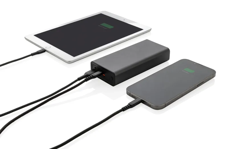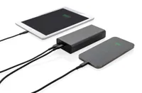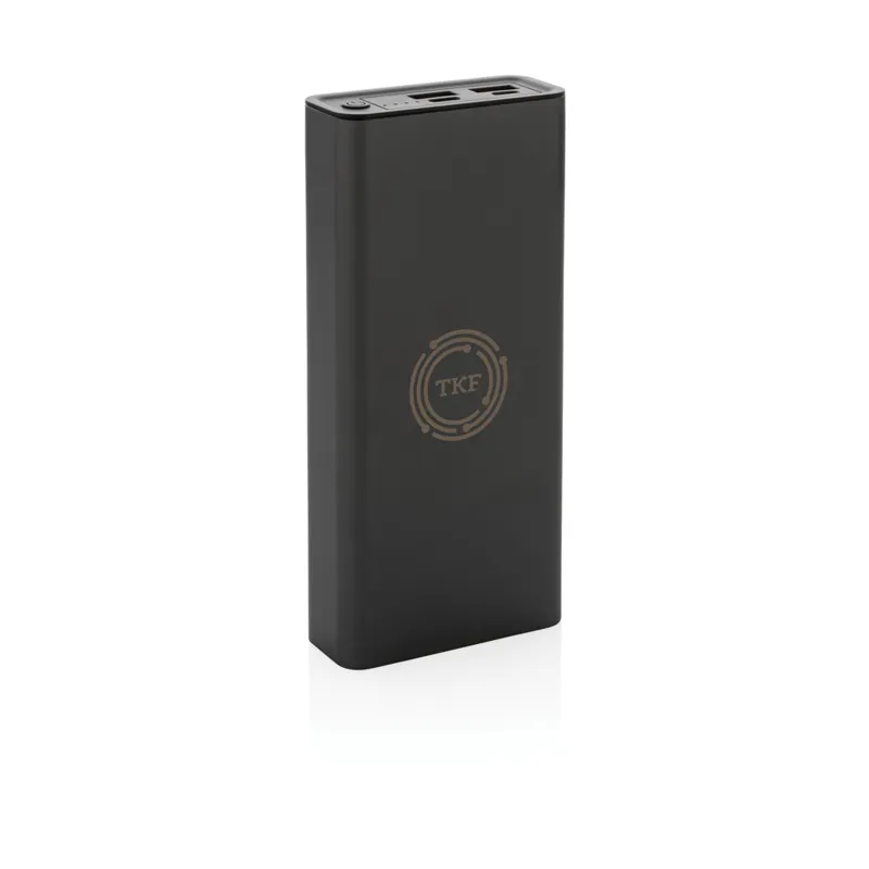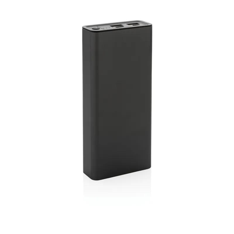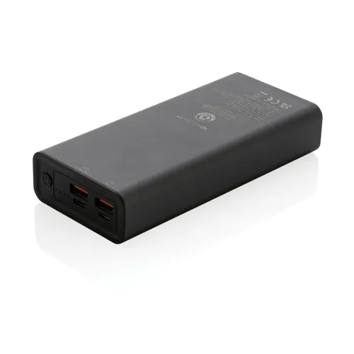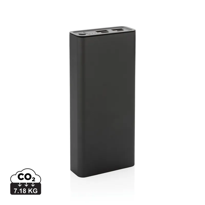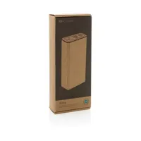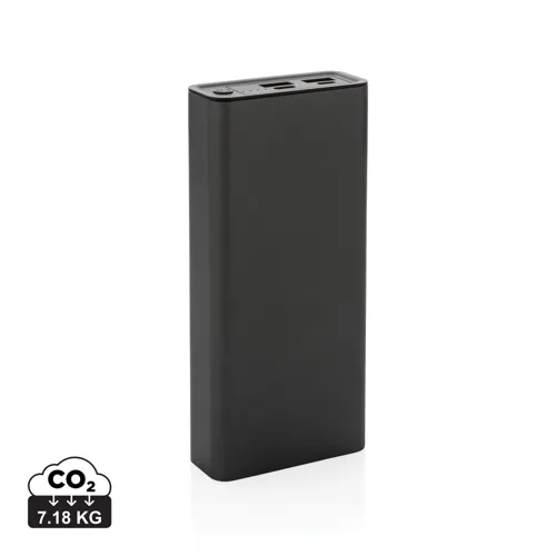 RCS (Recycled Claim Standard) újrahasznosított alumíniumból és ABS-ből készült ultragyors töltésű powerbank. Teljes újrahasznosított anyag tartalma: 21% a termék összsúlya alapján. Az RCS-tanúsítvány biztosítja az újrahasznosított anyagok ellátási láncát. Az alumínium nem veszíti el tulajdonságait az újrahasznosítási folyamat során és végtelenül újrahasznosítható. A powerbank hosszú élettartamú, A fokozatú, 20 000 mAh lítium-polimer akkumulátort tartalmaz. A C kimeneti csatlakozó akár 18W gyorstöltést és 5 órán belüli gyors újratöltést is támogat. Kettős USB A kimeneti csatlakozóval. Töltöttségjelző. A termék és tartozékai 100% PVC-mentesek. RCS újrahasznosított alumíniumból, TPE-ből és PET-ből készült C típusú töltőkábellel. FSC® mix csomagolásban. Kézipoggyászban történő légi szállítás engedélyezve (74 Wh). USB kimenete 5/3A, 9V/2A. 12V/1,5A. C típusú kimenet: 5V/3A, 9V/2A, 12V/1,5A. C típusú bemenet: 5V/3A, 9V/2A, 12V/1,5A. Micro USB bemenet: 5V/2A, 9V/2A, 12V/1,5A.
