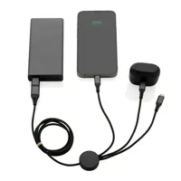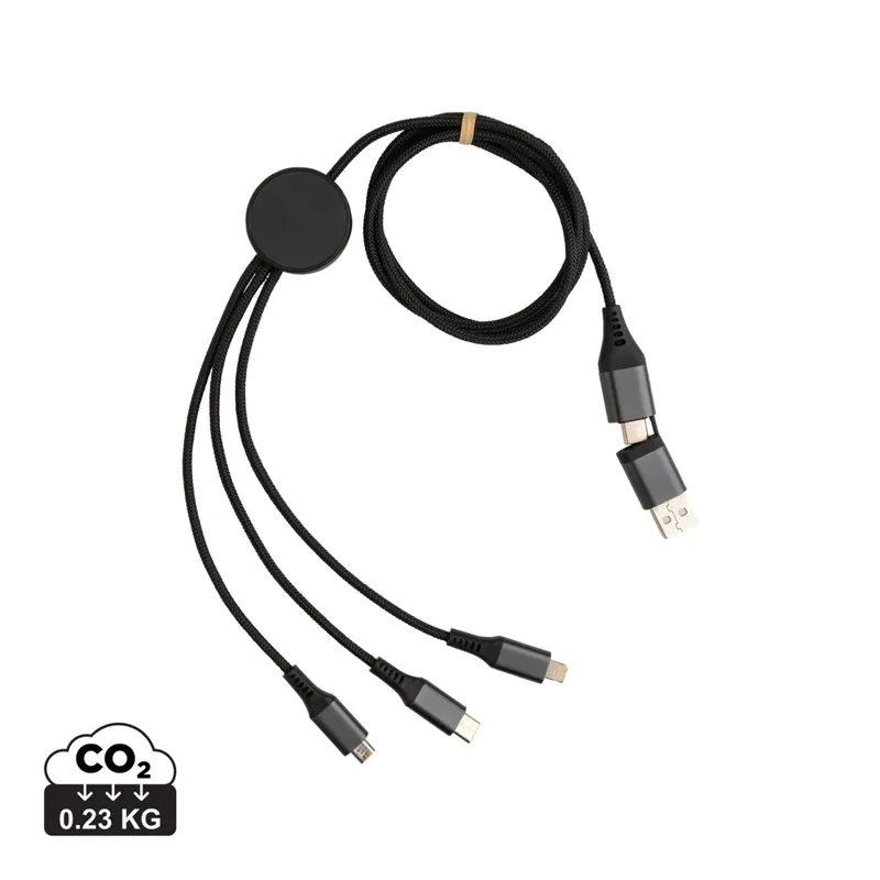 RCS (Recycled Claim Standard) újrahasznosított alumíniumból, újrahasznosított TPE-ből és újrahasznosított PET-ből készült töltőkábel. Teljes újrahasznosított anyag tartalom: 65% a termék összsúlya alapján. Az RCS-tanúsítvány biztosítja az újrahasznosított anyagok ellátási láncát. Az alumínium nem veszíti el tulajdonságait az újrahasznosítási folyamat során és végtelenül újrahasznosítható. Kettős bemeneti csatlakozóval: USB A és C típusú. Tripla kimenet: Apple Lightning/micro és C típusú, összesen 6 töltési lehetőséget kínál RCS 120cm hosszú, fonott újrahasznosított PET kábellel. FSC® mix csomagolásban. Töltésre, szinkronizálásra alkalmas és autós lejátszással kompatibilis (kizárólag C típusról C típusra). 9V/2A-ig támogatja a gyorstöltést.