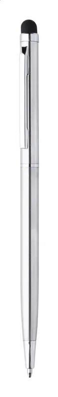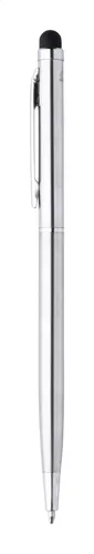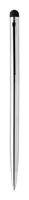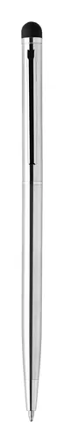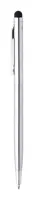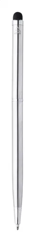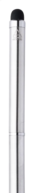 Újrahasznosított rozsdamentes acélból készült tekerős és érintőképernyős golyóstoll króm részekkel. Kék tollbetéttel.