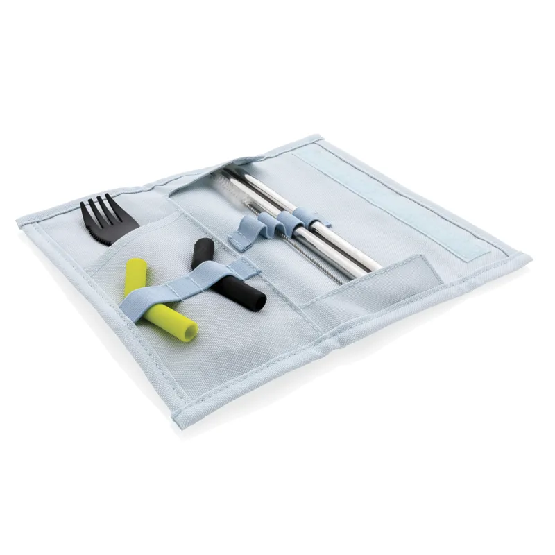 A Tierra 2 db-os szívószál és evőeszköz készlet többször használatos ezáltal ideális a műanyagfelhasználás csökkentéséhez. A szett tartalma 2 rozsdamentes acélból készült szívószál tisztítókefével, kanálként és villaként is használható evőeszközzel valamint 2 hajlított, szilikon szívószállal melyek a rozsdamentes acél szívószál végére rögzíthetőek a még kényelmesebb használathoz. Különböző színűek ezáltal könnyen meg is különböztethetőek. Tartóban érkezik Velcro tépőzáras záródással. Külseje 100% 600D poliészter, belseje 100% 210 D poliészter. PVC-mentes.