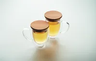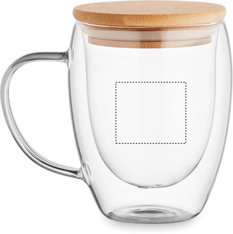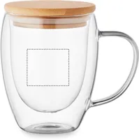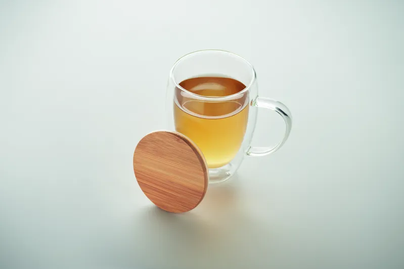Duplafalú boroszilikát üveg bögre bambusz fedéllel. Űrtartalom: 250 ml.