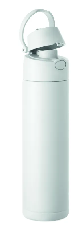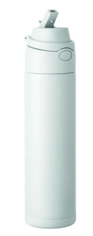 Szimplafalú palack 90% újrahasznosított rozsdamentes acélból és 10% rozsdamentes acélból, 2 az 1-ben szívószálas és ivónyílásos PP fedéllel, fogantyúval. Szivárgásmentes. Űrtartalom: 650 ml.