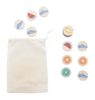 Egyedi gyártású, laminált nyír rétegelt lemezből készült memóriajáték egyedi grafikával, pamut tasakban. 24 darab lapkával (ø35 mm). Az ár tartalmazza a lapka elülső oldalán 12 különböző full-colour nyomatot, valamint az összes lapka hátoldalán az azonos full-colour nyomatot. Minimális rendelési mennyiség: 50 db.