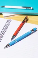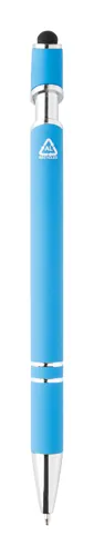 Újrahasznosított alumínium golyóstoll gumírozott testtel és króm részletekkel. Kék tollbetéttel.