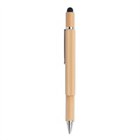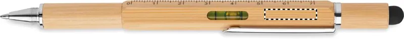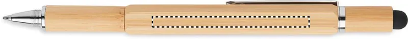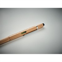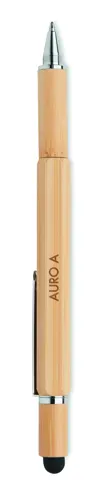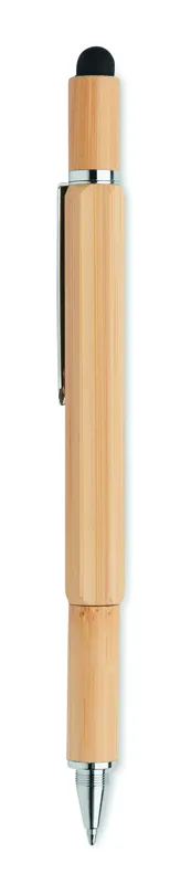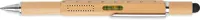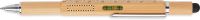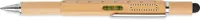Csavarmechanikás, érintőhegyes golyóstoll bambuszból, vízmértékkel, 7 cm-es vonalzóval, valamint csillag- és lapos fejű csavarhúzó bitekkel. Kéken író betéttel. A bambusz természetes anyag, színében, mintázatában és méretében esetenként eltérő lehet.