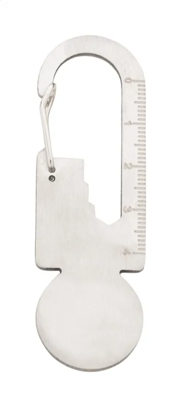 Újrahasznosított rozsdamentes acélból készült multiszerszám karabinerrel, bevásárlókocsi érmével, vonalzóval és 3 lapos kulccsal.
