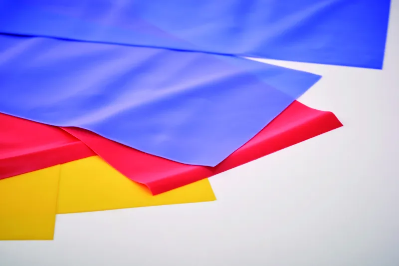 3 db TPE fitneszszalagból álló készlet RPET poliészter tasakban. A fitneszszalagok mindegyike különböző erősségű az optimális edzés érdekében.