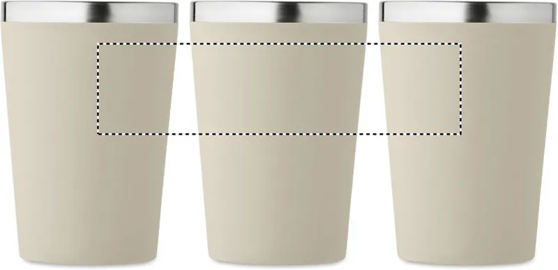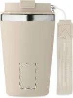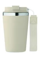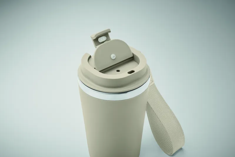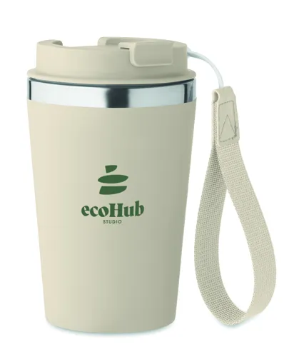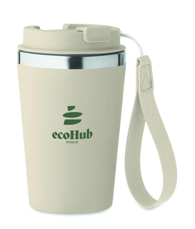 Duplafalú pohár újrahasznosított rozsdamentes acélból (90% újrahasznosított rozsdamentes acél és 10% rozsdamentes acél), PP külső réteggel, RPET csuklópánttal. Űrtartalom: 350 ml.