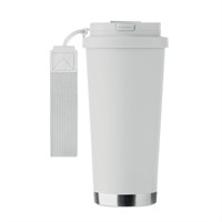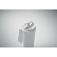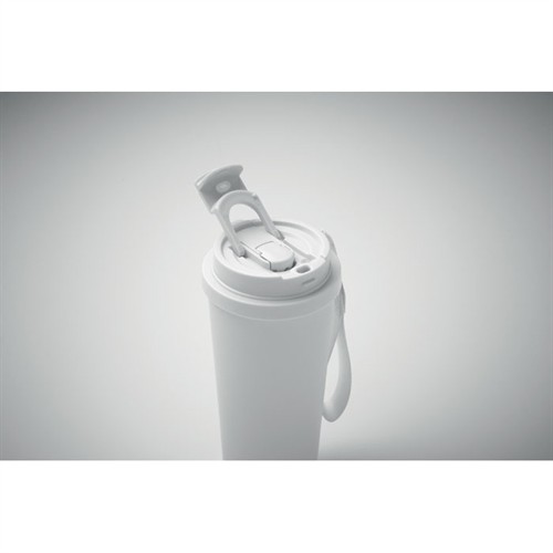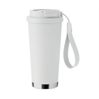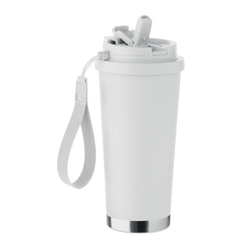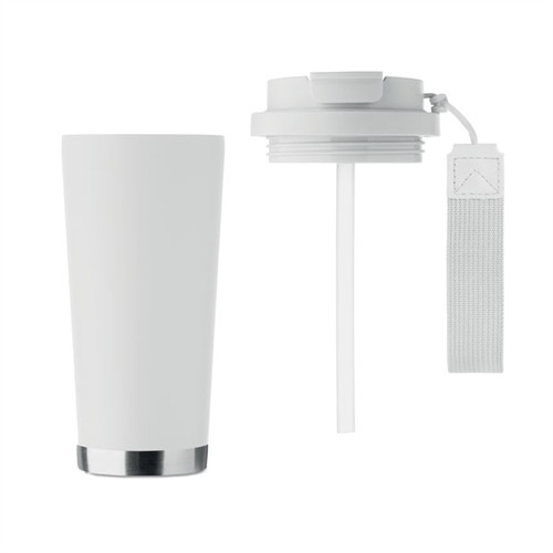 Duplafalú, újrahasznosított rozsdamentes acél (90% újrahasznosított rozsdamentes acél és 10% rozsdamentes acél) pohár, PP fedéllel (2 az 1-ben ivónyílással és szívószálas fedéllel) és RPET hordszíjjal. Szivárgásmentes. Űrtartalom: 500 ml.