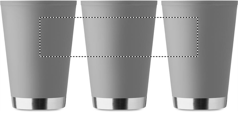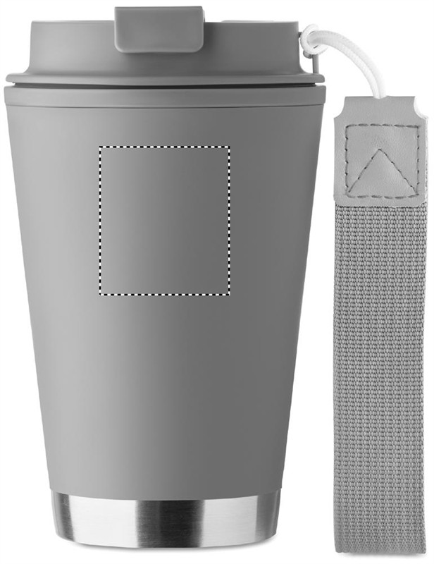 Duplafalú pohár PP belső- és újrahasznosított PP külső fallal, újrahasznosított rozsdamentes acél részlettel az alján, RPET csuklópánttal. Űrtartalom: 300 ml.