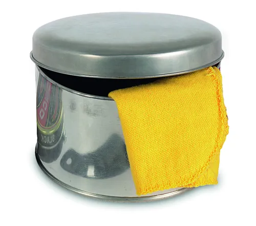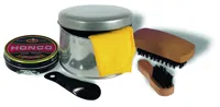 5 részes cipőtisztító készlet bádog ajándékdobozban. A készlet tartalmaz egy sárga cipőfényesítő kendőt, egy cipőkanalat, egy nagy kefét, egy kis kefét a apróbb részletekhez és egy semleges színű cipőfényező pasztát.