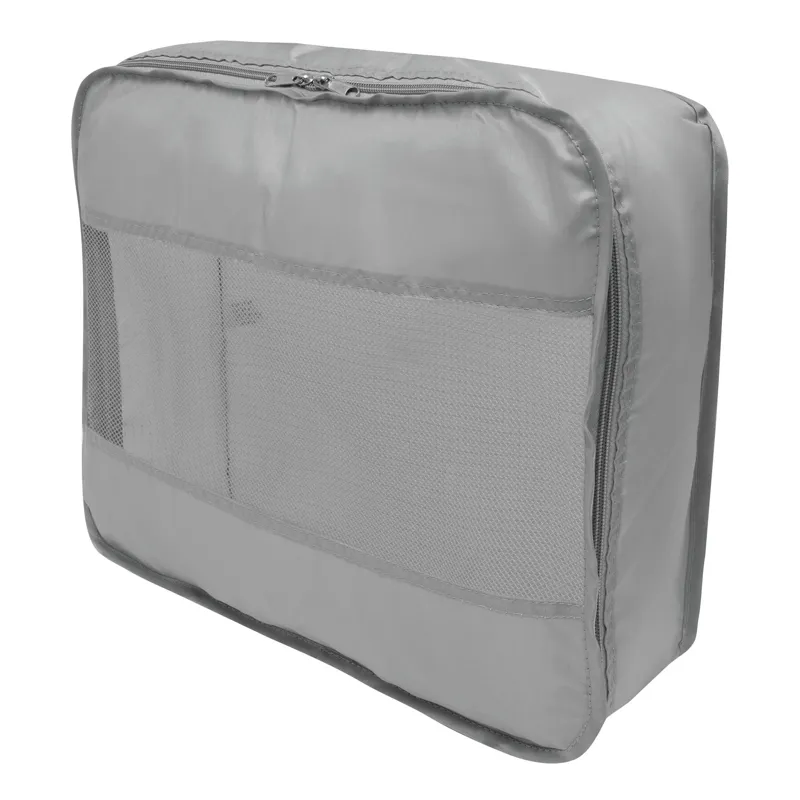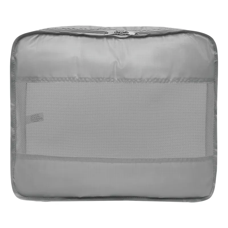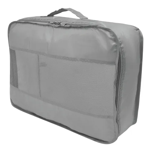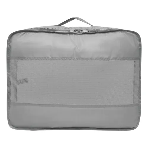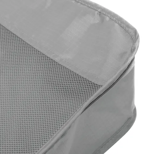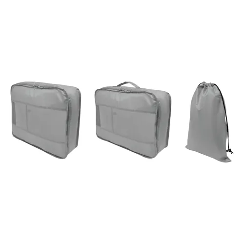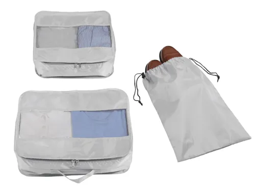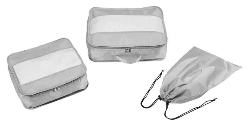 TRAVEL ATTENDANT utazó szett 3 részes: 2 db különböző méretű ruhazsák és 1 db cipőtároló zsák, a ruhazsákok hálószövött ablakkal a szellőzés és a könnyű betekintés érdekében, dupla cipzár, a nagy zsákon hordozó fül, a cipőzsák húzózsinóros záródással, 2 db műanyag zárral - a bőröndön belüli rendszerezésért
