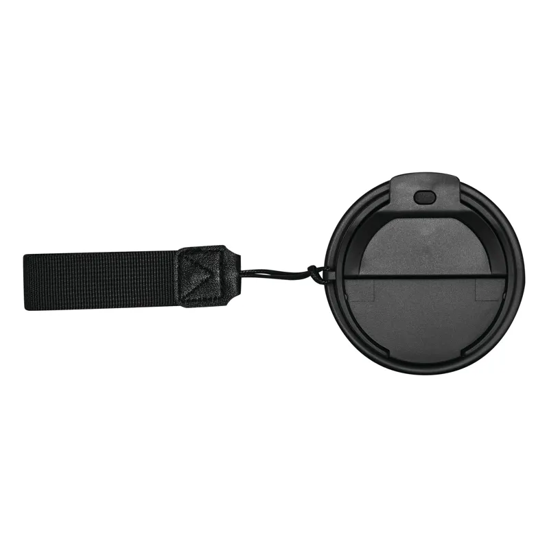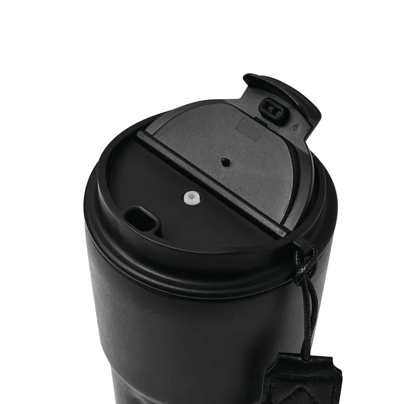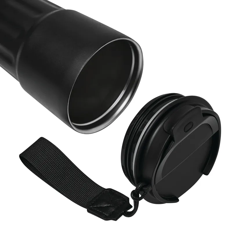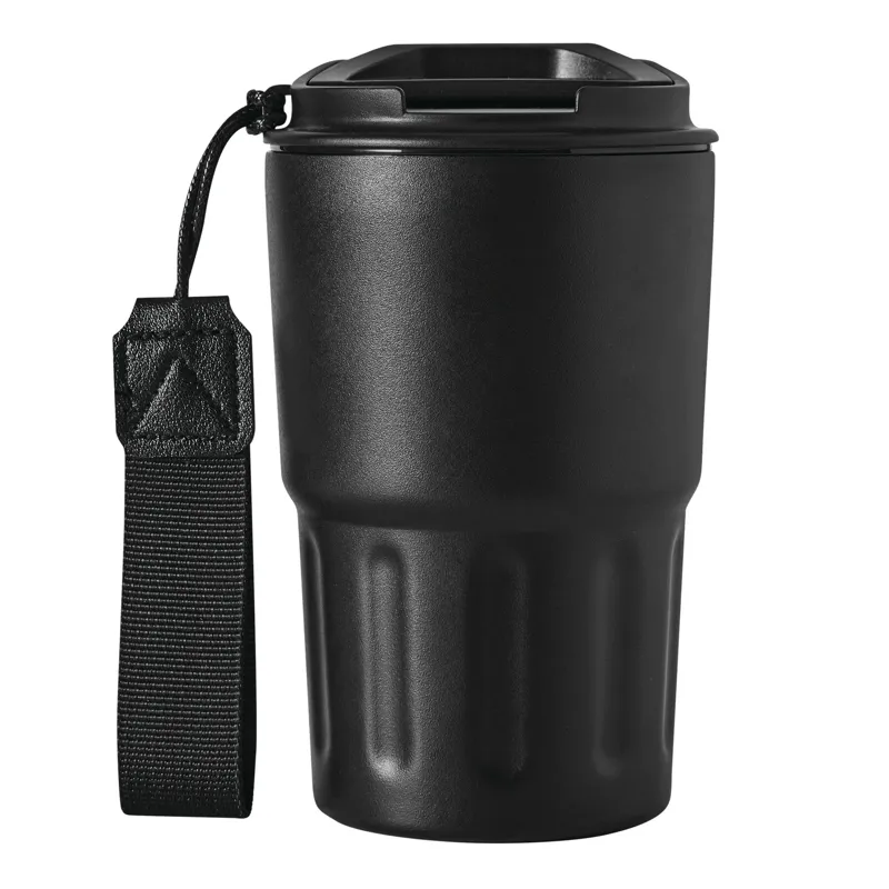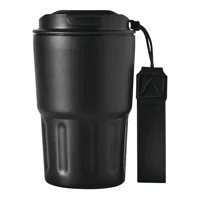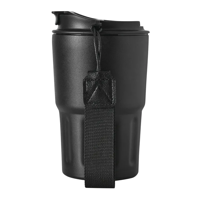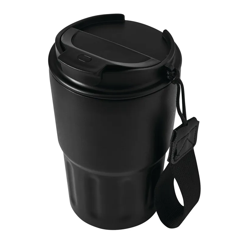 TRAVEL MUG hőszigetelt bögre, duplafalú: kívül-belül rozsdamentes acél, matt porfestett felület, műanyag fedél biztonságos csavaros kupakkal, szilikon tömítés, integrált ivónyílás, űrtartalom kb. 400 ml, újrahasznosított műanyagból készült csuklópánttal