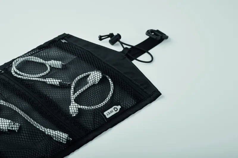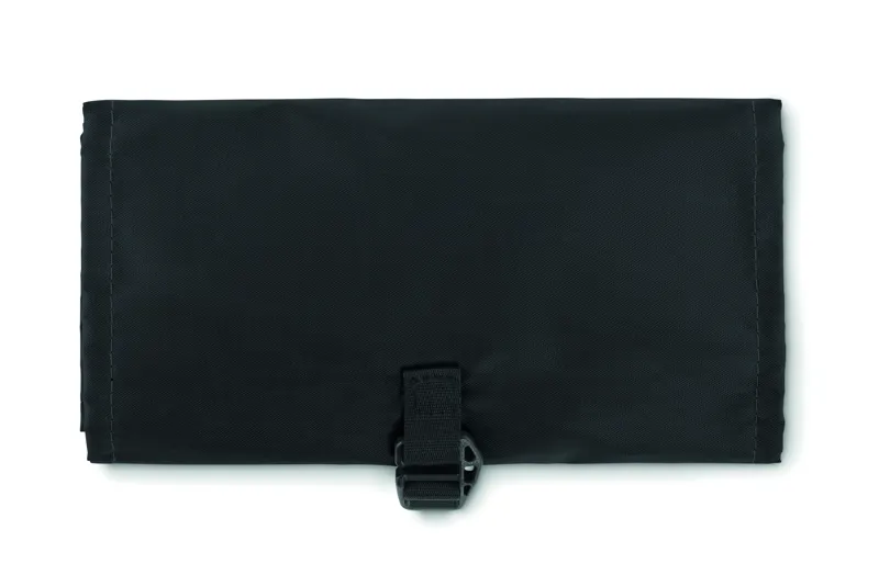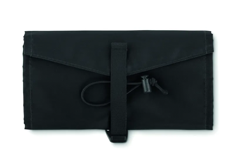 210D RPET kábel rendszerező, felcsavarható táska. RPET hálós anyag, 3 cipzáras rekesszel. Kozmetikai táskaként is használható.