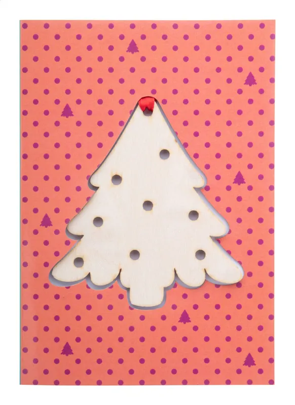 Egyedi grafikával, papírból készült, mindkét oldalán nyomtatható karácsonyi üdvözlőlap, fából készült karácsonyfadísszel piros szalagon. C6 borítékkal szállítjuk. Minimum rendelési mennyiség: 100 db.