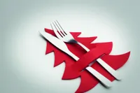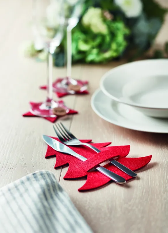 4 darab RPET filcből készült, karácsonyfa alakú evőeszköztartóból álló készlet, kraftpapír dobozban.
