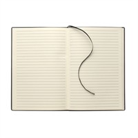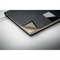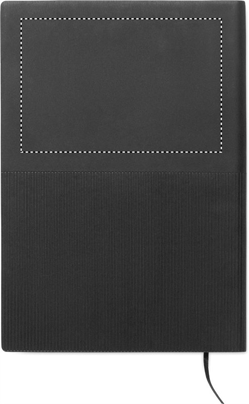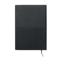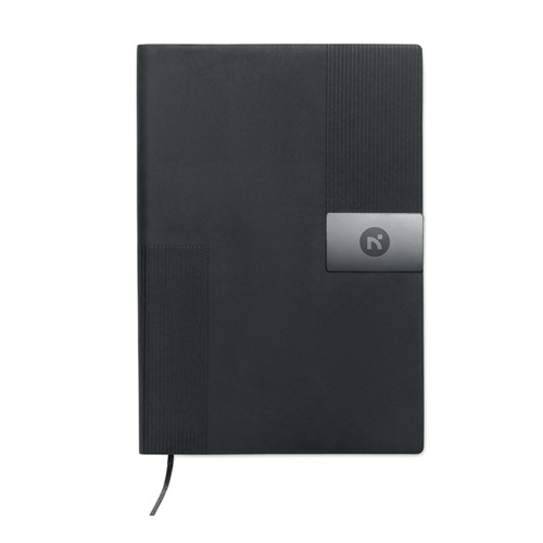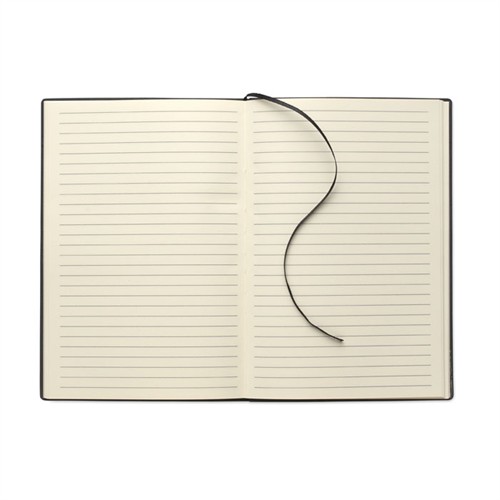 A5 jegyzetfüzet PU puhafedeles borítóval. Cérnafűzött. 160 vonalas oldal (80 lap), újrahasznosított papírból. Illeszkedő színű elasztikus zárópánt és könyvjelző szalag. Fém részlet az elülső oldalon.