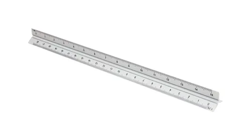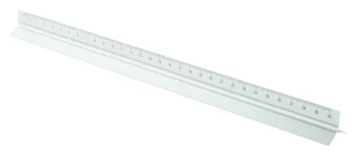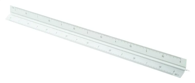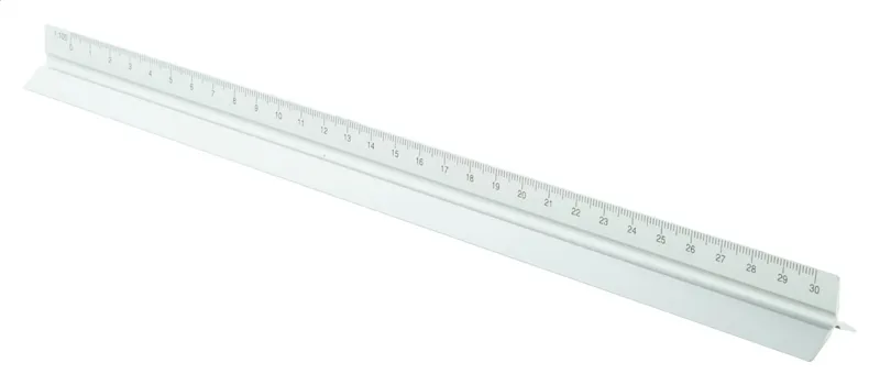 Háromszögletű, alumínium méretarány vonalzó. 30 cm-es vonalzóval és 1:20/1:25/1:50/1:75/1:100 méretarányú skálákkal.