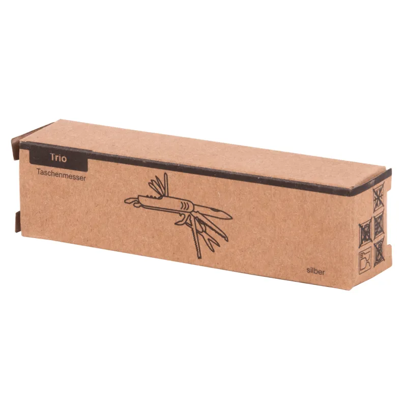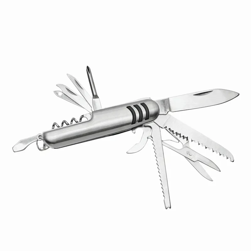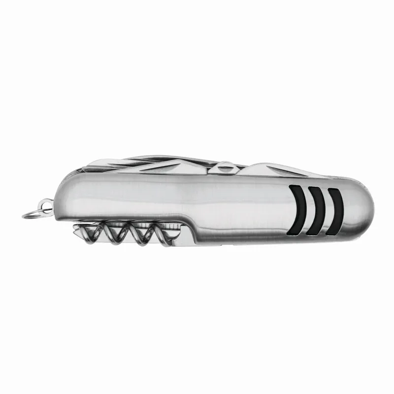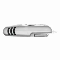 TRIO zsebkés csíkos kivitelben, konzervnyitóval, sörnyitóval, dugóhúzóval, körömreszelővel, phillips csavarhúzóval, ollóval, két fűrésszel, pikkelyezővel, árral, tőrözővel és kulcskarikával
