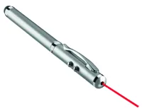 Fém lézermutató. Fehér LED, piros lézermutató fény és puha érintőhegy vég. A működéshez szükséges 3 db LR41 gombelemmel szállítjuk. Bádogdobozban.
