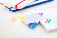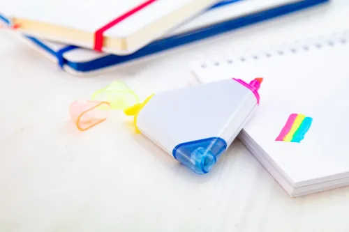 Háromszög alakú szövegkiemelő, három különböző színnel, áttetsző kupakokkal.