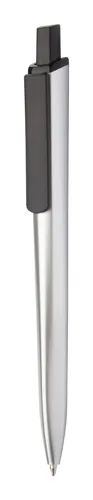 Műanyag golyóstoll fekete részekkel és matt, fémes véggel. Kék tollbetéttel szállítjuk.