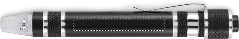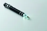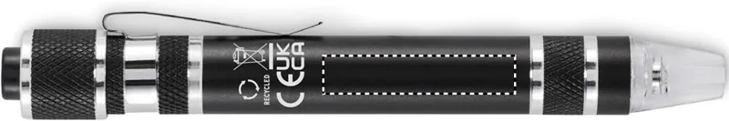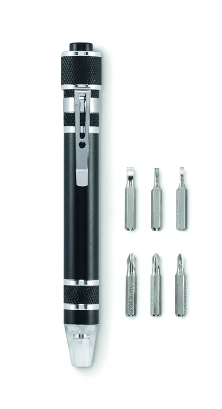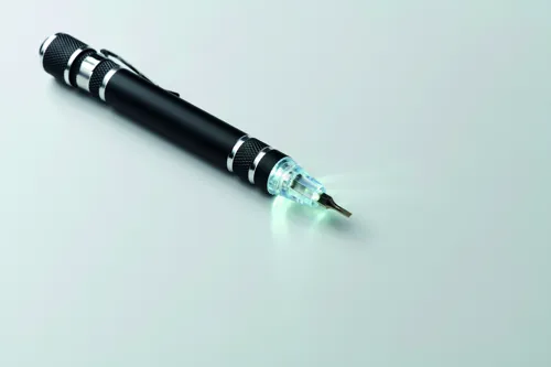 Golyóstoll alakú, újrahasznosított alumínium multifunkciós szerszám zseblámpával. 3 lapos és 3 csillag csavarhúzófejjel. A működéshez szükséges 4 db LR41 gombelemmel szállítjuk.