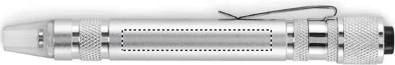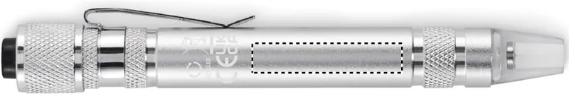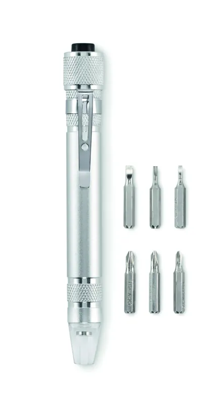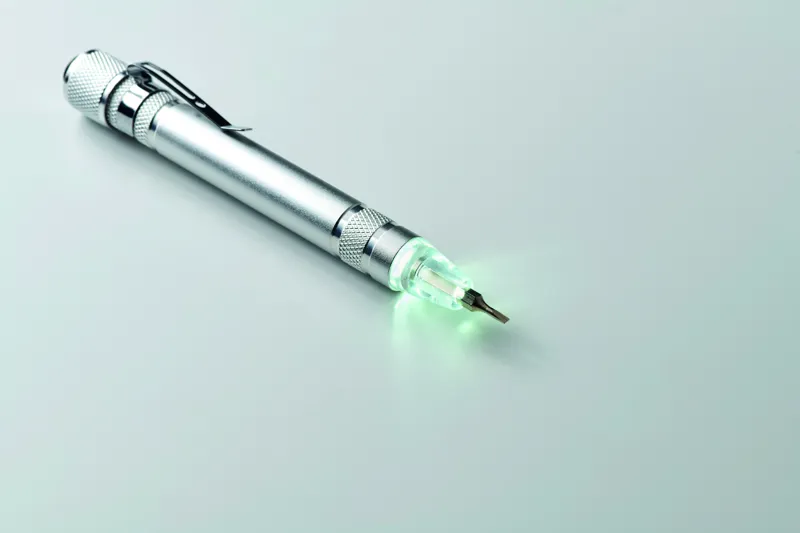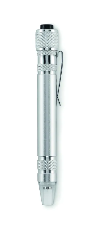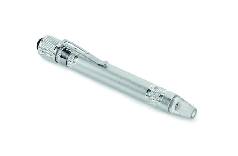 Golyóstoll alakú, újrahasznosított alumínium multifunkciós szerszám zseblámpával. 3 lapos és 3 csillag csavarhúzófejjel. A működéshez szükséges 4 db LR41 gombelemmel szállítjuk.