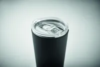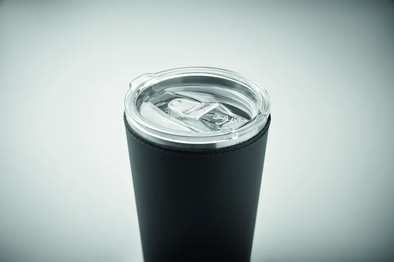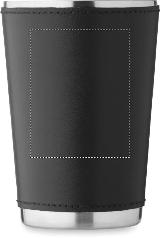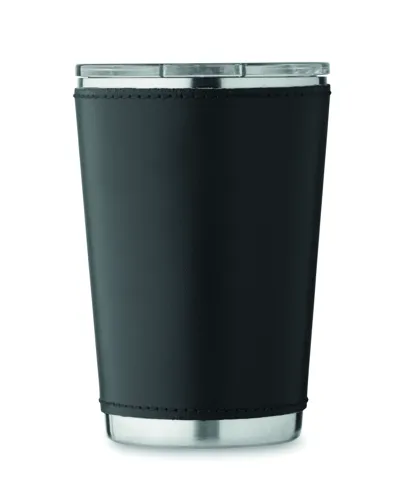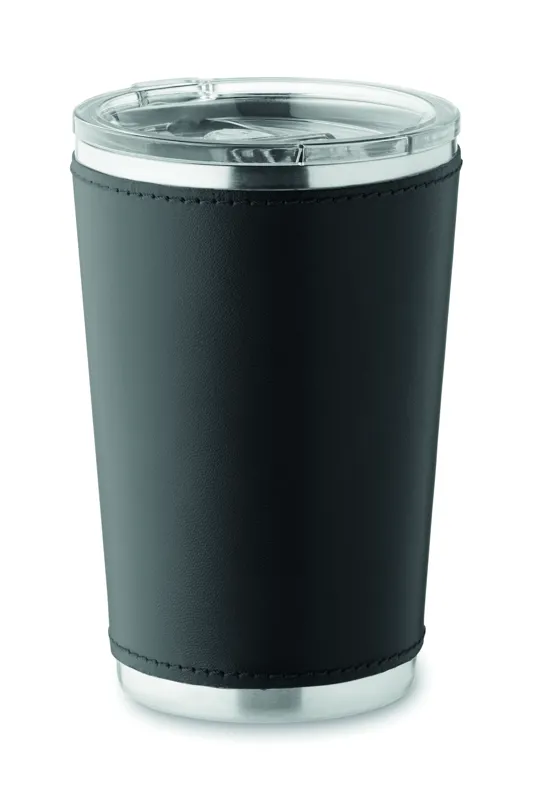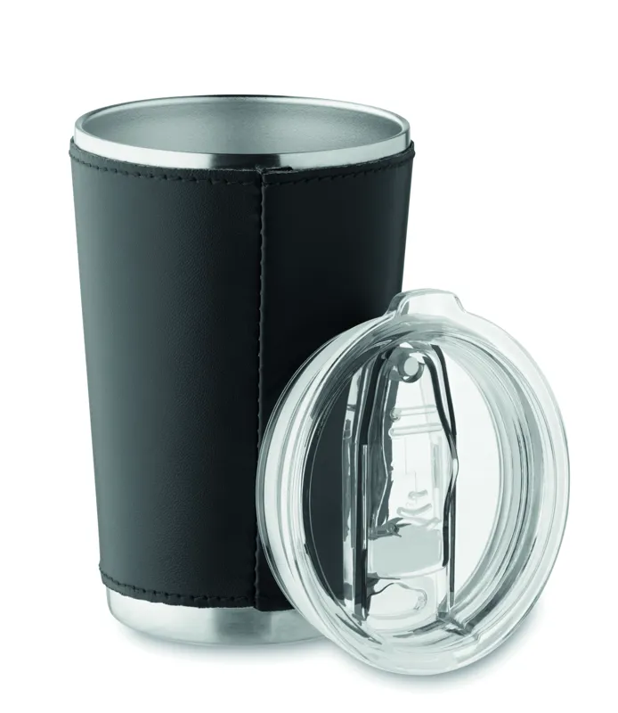 Duplafalú pohár újrahasznosított rozsdamentes acélból (90% újrahasznosított rozsdamentes acél és 10% rozsdamentes acél), levehető PU bőr tokkal. Fedél csúsztatható ivónyílással. Szivárgásmentes. Űrtartalom: 350 ml.
