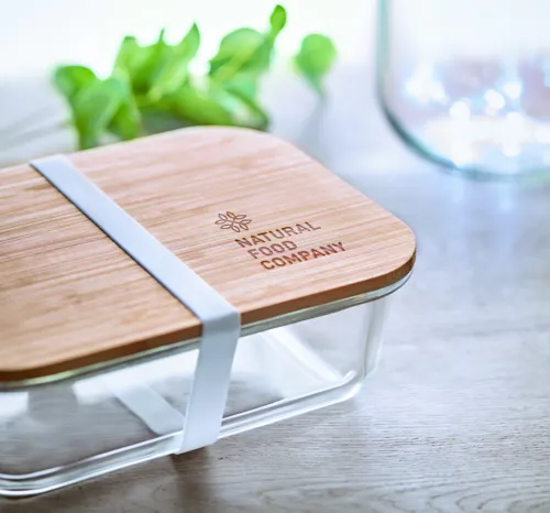 Üveg uzsonnásdoboz bambusz tetővel, a fedelet rögzítő szilikon pánttal. Űrtartalom 800ml. A bambusz természetes anyag, termékenként szín- és méretbeli eltérések jelentkezhetnek, ami befolyásolhatja a dekoráció végső eredményét.