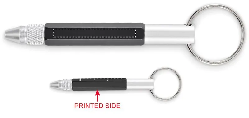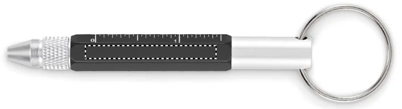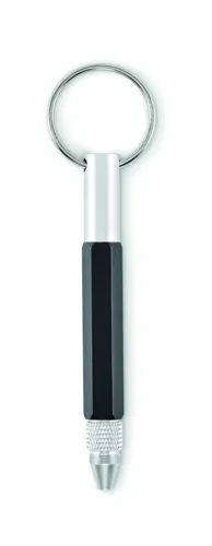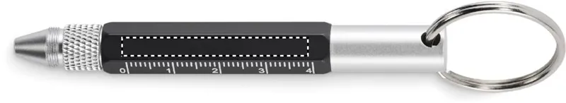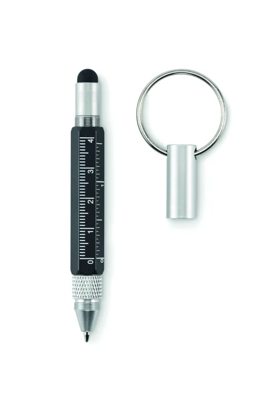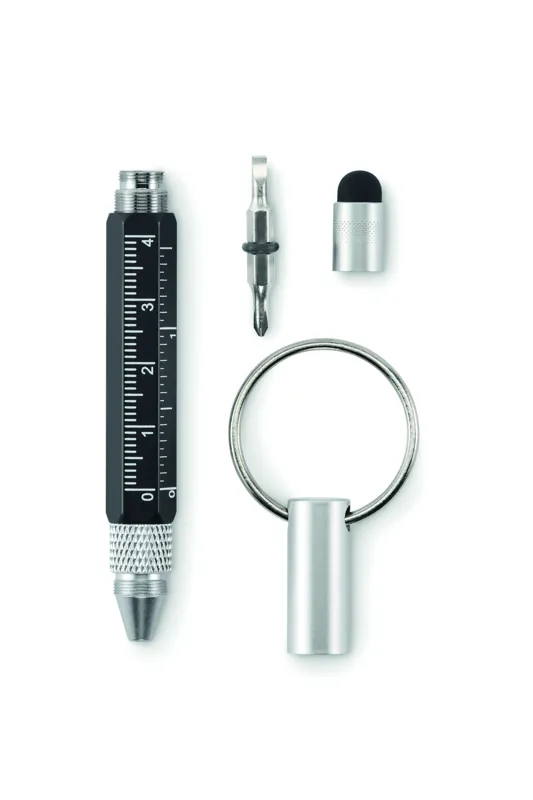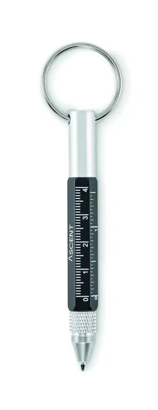 Kulcstartó csavarzáras golyóstollal újrahasznosított alumíniumból, 4 cm-es és 1 ,5 colos mini vonalzóval, érintőheggyel és 2 az 1-ben lapos- és csillag csavarhúzóval. Feketén író betéttel.